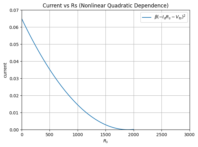 Recall that $V_{TO}$ is negative which results in a negative value. This translates to a decreasing current with increasing resistance. Additionally, note that this equation is nonlinear.