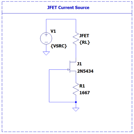 The JFET current source is one of the simplest to implement. It consists of a Junction Field Effect Transistor (JFET) and a resistor. These can also be purchased in a standalone package known as a constant current diode.