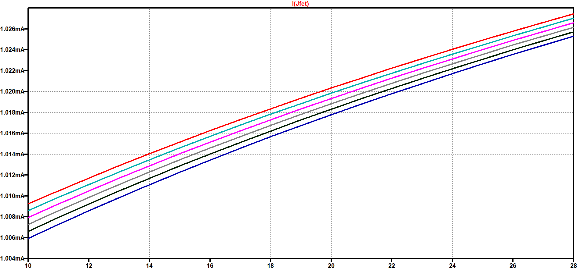 The JFET circuit was simulated in LTspice. It is relatively stable with changes in supply voltage but varies slightly due to channel-length modulation. 1 This channel length modulation effect is shown as an increasing curve with applied voltage.